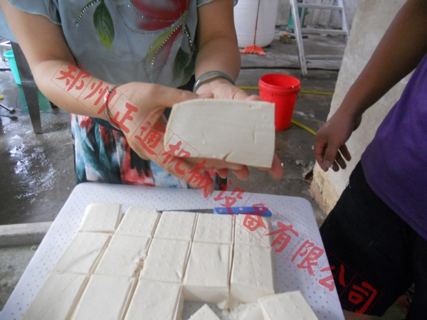 ?? 4、再制成自己需要的豆腐如水豆腐,豆腐花凝結(jié)約15分鐘內(nèi),用勺子輕輕舀進(jìn)已鋪好包布的木托盆(或其它容器)里,盛滿后,用包布將豆腐花包起,蓋上板,壓10~20分鐘,即成水豆腐。或制豆腐干。將豆腐花舀進(jìn)木托盆里,用布包好,蓋上木板,堆上石頭,壓盡水分,即成豆腐干。一般10公斤黃豆可制25公斤豆腐干。